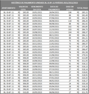 O terceiro ponto e o mais relevante é a provável ação de uma empresa de cobrança nessa unidade a partir de 2022. Conseguimos identificar isso analisando os pagamentos conforme o passar dos anos: Em 2021 ele pagava 1 cota por mês, mas continuava devendo 3, ou seja, a vencida em 10/01/2021 foi paga em 26/04/2021 quando já acumulava a cota 10/02/2021, 10/03/2021 e 10/04/2021 em atraso. Em 09/2022 tivemos o pagamento de 2 cotas juntas, e desde então começou a pagar pontualmente em seu recebimento (5º dia útil), além de deixar apenas 01 em aberto e não mais 02 ou 03. Isso demonstra que houve uma interferência significativa nas ações de cobrança a partir de 09/2022.